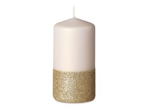 Svíčka ve tvaru válce má matný povrch a je zdobena třpytivými vločkami.