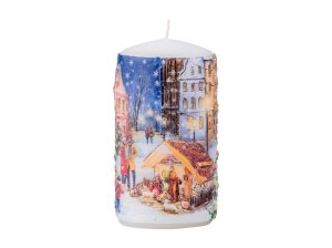 Svíčka ve tvaru válce. Vánoční svíčka s aplikací jemných glitrů imitující zasněženou krajinu s dekorací třech skřítků.