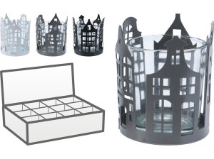 Hliníkový svícen s motivem domků – černý a přírodní, dekorativní a praktický.