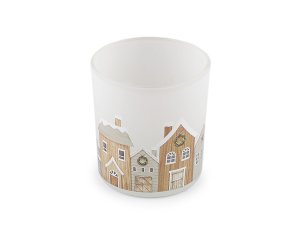 Skleněný svícen s motivy domečků můžete použít s klasickými čajovými svíčkami nebo LED svíčkami pro bezpečnější provoz.