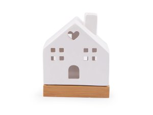 Plechový svícen na čajovou svíčku ve tvaru domku o rozměru 200×110×320 mm.