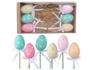 Zápich plastové kraslice 60 mm s motivem kytičky, 6 ks ve špejli, baleno v krabičce, mix barev.