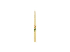 Velikonoční svíčka ve tvaru válce je ozdobena vyřezávaným obrázkem zajíce s vejce a květinami.