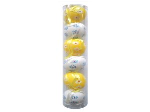 Sada 6 kraslic 60 mm v žlutých a bílých odstínech s jemným květinovým motivem, balená v sáčku.