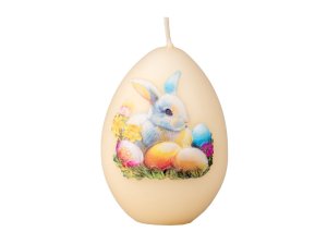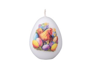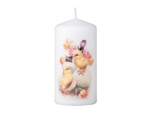 Válcová svíčka o rozměru 60×110 mm s motivem košíku s vajíčky.