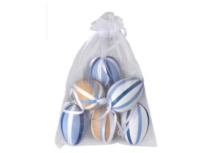 Sada 6 kraslic 60 mm s dekorativním proužkem, v organzovém sáčku, v různých barevných variantách.