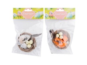 Dekorativní hnízdo o velikosti 80 mm z plastu a proutí s kropenatými vajíčky a ptáčky.