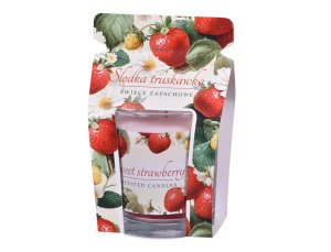 Dekorativní vonná svíčka ve skle s ovocným potiskem voní po zralých jahodách a navozuje příjemnou, sladkou atmosféru.