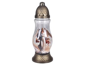 Skleněná lucerna s náboženským motivem Panny Marie a 24hodinovým vkladem.