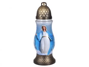 Hřbitovní lampa válcovitého tvaru se zdobením v podobě decentních zlatých ozdob: kříže a růže.