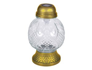 Skleněná hřbitovní lampa ve tvaru koule, s bohatým reliéfním zdobením.