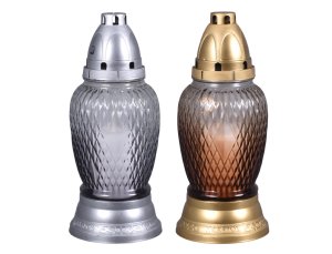 Skleněná hřbitovní lampa s plastickým reliéfem kosočtverců, které jsou elegantně doplněny hladkým svislým pruhem.