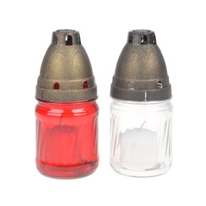 výška: 15 cm hmotnost: 35 g parafín mix barev doba hoření svíčky v lampě: 9 hod Skleněná hřbitovní lampa na svíčky 15 cm s kuželovitým víkem proti dešti a proti uhašení plamínku větrem.