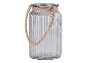 Prostornější skleněná lampa s lanovým závěsem, pro svíčku nebo světelný řetěz.