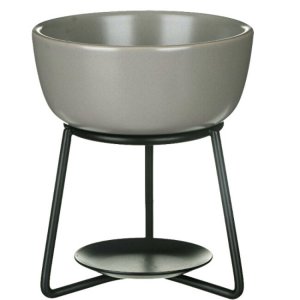 Šedá aromalampa Pebble s mističkou z keramiky na kovovém podstavci je určená k rozpouštění vonného vosku čajovou svíčkou.