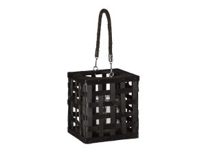 Černá proutěná lampa s uchem a závěsem na svíčku – dekorativní a přenosná pro útulnou atmosféru.