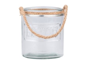 Prostornější skleněná lampa s lanovým závěsem, pro svíčku nebo světelný řetěz.