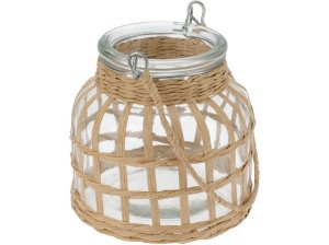 Skleněná lampa s lanem pro zavěšení, vhodná na svíčku, přírodní styl.