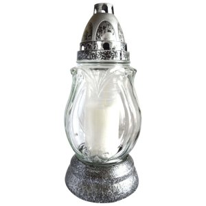 Skleněná hřbitovní svíčka s vyměnitelnou parafínovou náplní 30g, s plastovým spodkem, zajišťujícím dobrou stabilitu skla a plastovým vrškem, který chrání plamen před zhasnutím vlivem větru a deště.
