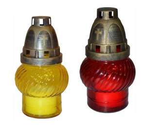 Skleněná hřbitovní lampa na svíčky s kuželovitým víkem proti dešti a proti uhašení plamínku větrem. výška: 14 cm mix barev parafínová svíčka - hmotnost: 30 g doba hoření: 9 hod