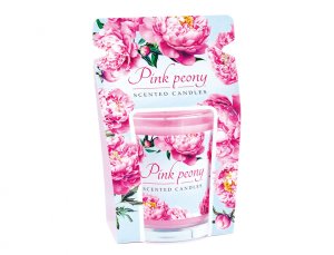 Vonná svíčka ve skle s papírovou etiketou a papírovým přebalem, zdobené bohatými květy růžových pivoněk.