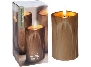 LED svíčka v hnědé barvě o rozměrech 75x75x125 mm s realistickým plápolajícím efektem a povrchovou úpravou.