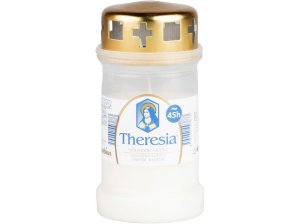 Litá svíčka s bílým víčkem a obrázkem, vhodná pro hřbitovní použití.