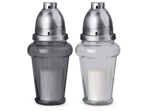 Skleněná hřbitovní lampička s černým plastovým víčkem.