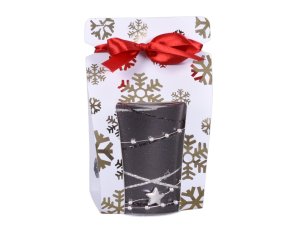 Vonná svíčka ve skle ozdobeném glitrovými proužky a hvězdičkami.