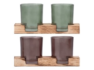 Sada dvou barevných skleněných svícnů na dřevěném tácku – elegantní a dekorativní.
