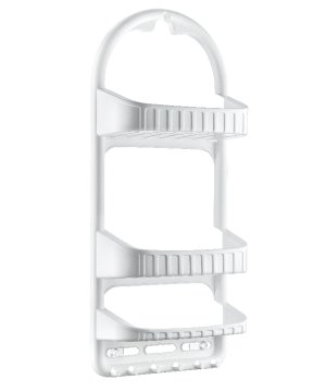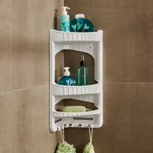 Třípatrová rohová plastová police s háčky na zavěšení, určena k montáži na stěnu.