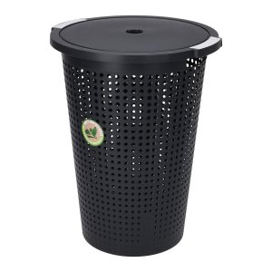 Koš na prádlo, objem 56 litrů, větrání díky drobným otvorům, madla pro pohodlné přenášení, víko s úchytkou pro zavěšení víka za okraj koše, 70% recyklovaný plast.