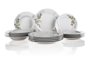 Sada jídelní OLIVES 18díl., porcelánová BÍ. sada obsahuje: 6 x dezertní talíř, pr. 19 cm 6 x hluboký talíř, pr. 21,5 cm 6 x mělký talíř, pr. 24 cm 18dílná talířová sada OLIVES s dekorem olivy, je vyrobena …