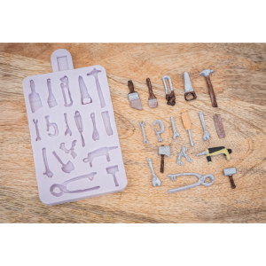 Silikonová forma „Miniaturní nářadí“ od značky Karen Davies, ideální pro vytváření realistických cukrářských dekorací ve tvaru malých nástrojů.