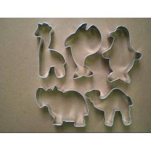 V sadě najdete vykrajovátka na cukroví ve tvaru velryby, velblouda, žirafy, tučňáka a hrocha.
