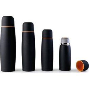Černá termoska s oranžovým pruhem o objemu 0,35 l.