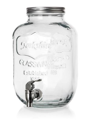 Láhev 5200 ml, skleněná, s kohoutkem, kovové víčko. objem: 5,2 l Skleněný zásobník na nápoje o objemu 5,2 l, slouží k servírování osvěžujících nápojů na oslavách a letních párty.