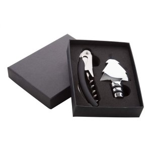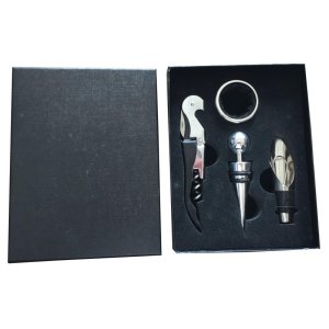 materiál: Zn, ABS Čtyřdílná sada obsahuje otvírák na lahve s vývrtkou a nožíkem, uzávěr na lahve, kroužek na hrdlo láhve, nálevku.