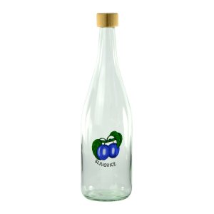 Skleněná čirá láhev Peggy je ideální na destiláty, včetně dřevěného víčka, dekorovaná obrázkem švestky.