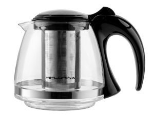 Skleněný čajník s nerezovým sítkem a plastovou ručkou.
