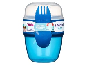 Praktická dóza na svačinu Sistema® TO GO™ Snack Capsule se 2 přihrádkami, kombinace vidličky a lžičky součástí.