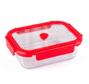 Borosilikátová skleněná zapékací dóza 640 ml s plastovým víkem uzavíratelným na klipy.
