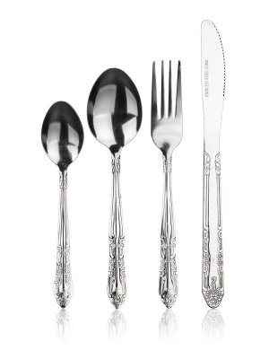 24dílná sada příborů APETIT DEBORAH se skládá: vše po 6 ks - nůž 20,9 cm, vidlička 17,6 cm, lžíce 17,3 cm, čajová lžička 13,2 cm.