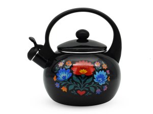 Kvalitní čajová konvice vyrobená z nerezové oceli se smaltovaným povrchem zvenku i uvnitř.