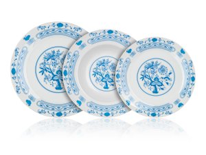 Sada jídelní ONION 18díl., porcelánová BÍ. sada obsahuje: 6 x dezertní talíř, pr. 19 cm 6 x hluboký talíř, pr. 21,5 cm 6 x mělký talíř, pr. 24 cm 18dílná talířová sada ONION s dekorem cibulák, je vyrobena …