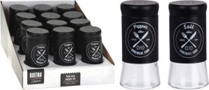 Kořenka 140 ml, sklo / kov, mix dekorů. objem: 140 ml rozměry (v. x pr.): 11 x 5 cm materiál: sklo / kov mix dekorů: "salt", "pepper" 12 ks v displeji Skleněná kořenka s černým kovovým víčkem a …