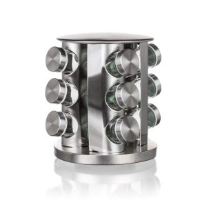 Kořenka AKCENT skl. + kov. (12 ks), s otočným stojánkem nerez. rozměry jedné kořenky s víčkem: 4,4 x 9,5 cm objem jedné kořenky: 85 ml rozměry stojanu: materiál: sklo, kov, plast sada kořenek Akcent …