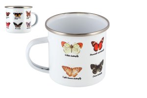 Smaltový plechový hrneček s designem motýlů a jejich názvy.