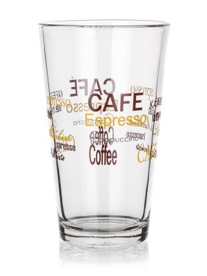 Sklenice 480 ml CAFE VALUE. objem: 480 ml Sklenice VALUE, o objemu 480 ml, v konickém tvaru, je vyrobena z čirého skla s dekorem CAFE.