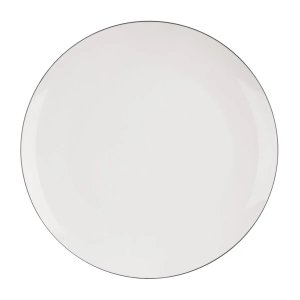 Elegantní porcelánový mělký talíř má hladký bílý povrch a je zdoben jemnou černou linkou po okraji, která podtrhuje jeho vytříbený vzhled.